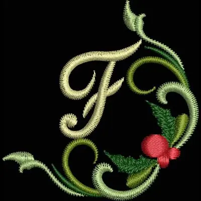 This digital machine embroidery design features a stylized letter "F" adorned with delicate green leaves and a red berry. Available in all hoop sizes.