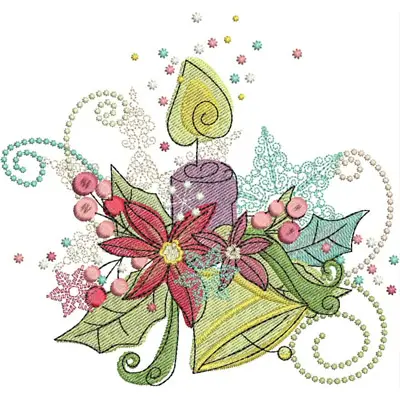 This digital machine embroidery design features a beautifully arranged candle surrounded by festive flowers, leaves, and decorative swirls. Available for 5X7 hoops.