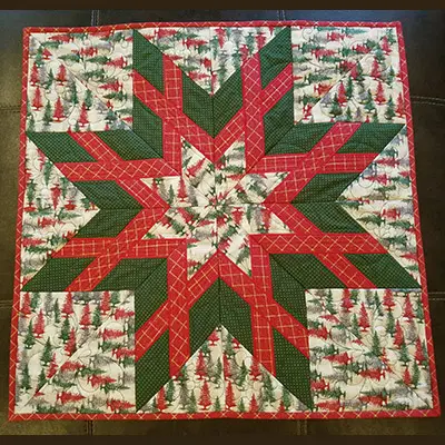 This digital machine embroidery design features a vibrant, geometric star pattern featuring red, green, and white sections, ideal for a festive decoration. Available in all hoop sizes.