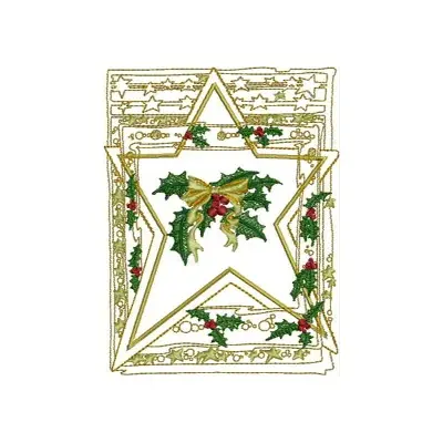 This digital machine embroidery design features a star framed with holly leaves and berries, adorned with decorative outlines. Available in all hoop sizes.