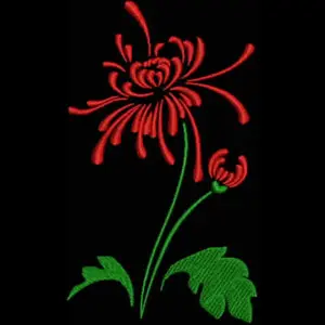 This digital machine embroidery design features a vibrant red flower with intricate petals and green leaves.