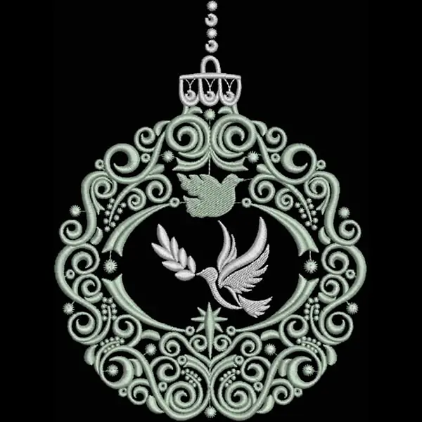 This digital machine embroidery design features an ornate circular frame featuring two stylized birds and decorative flourishes. Available in all hoop sizes.