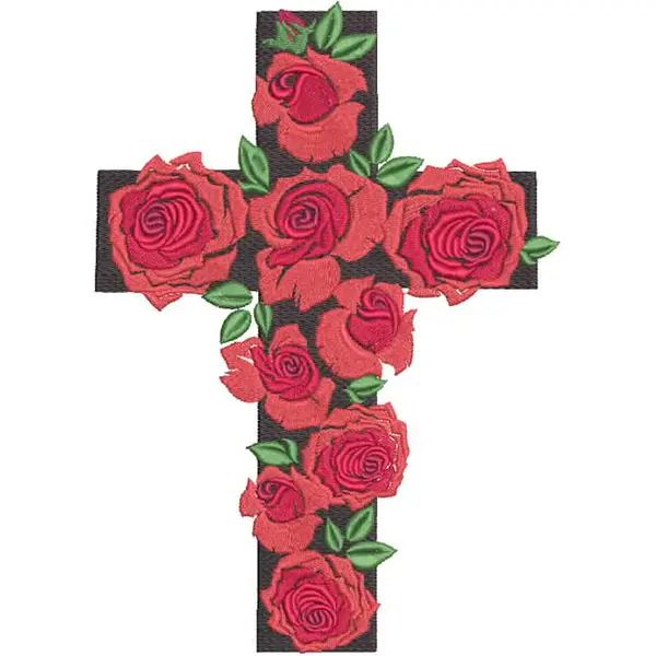 This digital machine embroidery design features a cross adorned with vibrant red roses and green leaves. Available in all hoop sizes.