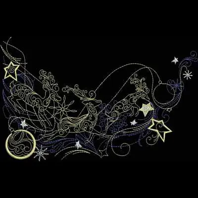 This embroidery design features elegantly swirling reindeer and whimsical stars, featuring intricate patterns and flowing lines. Available in all hoop sizes.