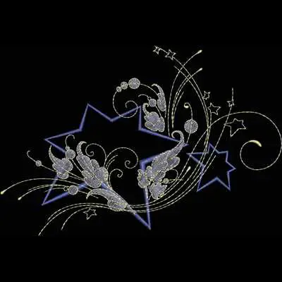 This digital machine embroidery design features swirling floral elements accented by blue stars and delicate lines. Available in all hoop sizes.