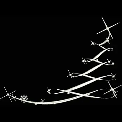 This embroidery design features a stylized, swirling Christmas tree made of delicate, flowing lines and scattered snowflakes. Available in all hoop sizes.