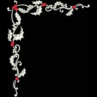 This digital machine embroidery design features a decorative corner featuring holly leaves, berries, and elegant swirling vines. Available in all hoop sizes.