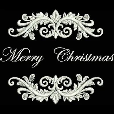 This digital machine embroidery design features ornate flourishes surrounding the text "Merry Christmas" in an elegant script. Available in all hoop sizes.