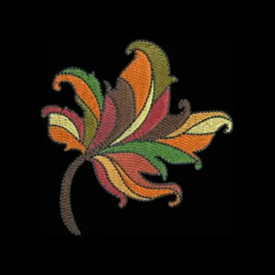 This digital machine embroidery design features a stylized leaf featuring vibrant hues of green, orange, brown, and yellow with artistic, flowing elements. Available for 4X4 hoops.