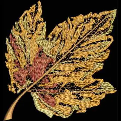 This digital machine embroidery design features a detailed autumn leaf, showcasing vibrant colors and intricate stitching. Available for 5X5 hoops.
