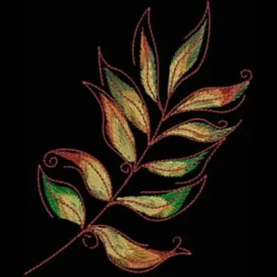 This embroidery design features a stylized leafy branch featuring rich shades of green, gold, and brown. Available for 5X5 hoops.