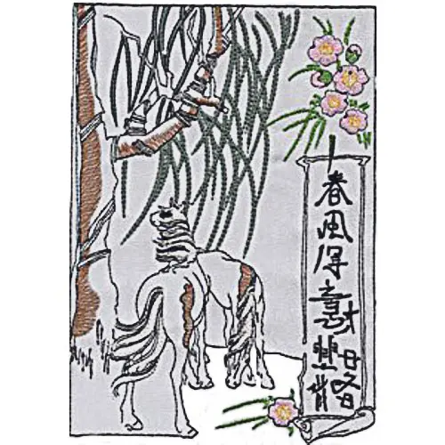 This digital machine embroidery design features a majestic dog standing beneath a tree adorned with delicate flowers, accompanied by artistic characters on a scroll. Available for 5X7 hoops.