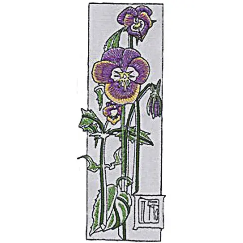 This digital machine embroidery design features a vibrant purple and yellow pansy flower with green leaves, showcasing intricate detailing in the petals and foliage. Available for 5X7 hoops.