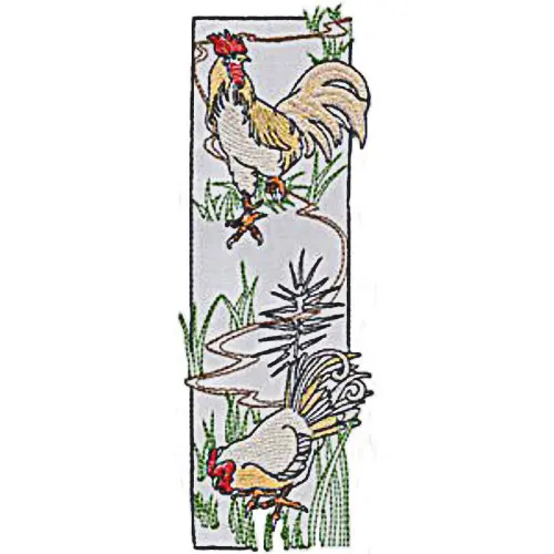 This digital machine embroidery design features two roosters amidst floral elements, showcasing detailed feather patterns and vibrant colors. Available for 5X7 hoops.