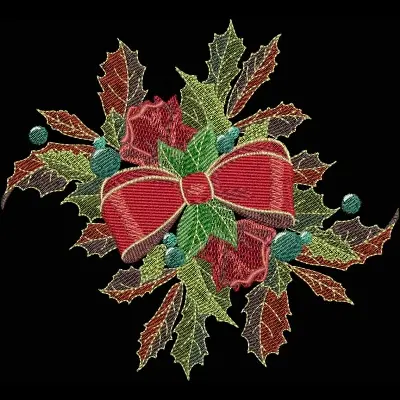 This digital machine embroidery design features a festive arrangement featuring a vibrant red bow surrounded by holly leaves and berries. Available in all hoop sizes.
