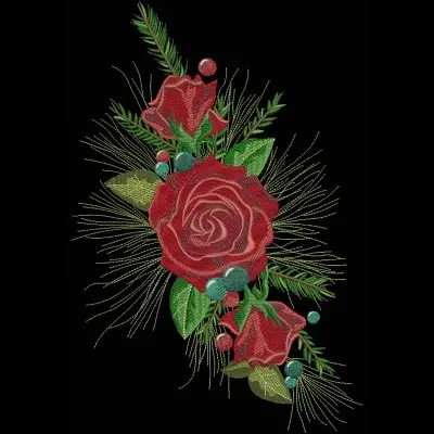 This embroidery design features vibrant red roses complemented by lush green leaves and decorative berries, arranged in an elegant composition.