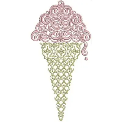 An embroidery design of a whimsical ice cream cone featuring a swirled pink top and a detailed green waffle cone.