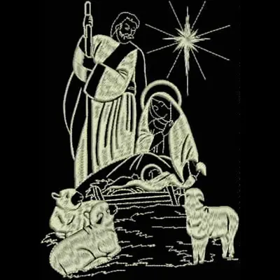 This digital machine embroidery design features a nativity scene featuring Mary, Joseph, and baby Jesus surrounded by sheep and a bright star above. Available for 5X7 hoops.