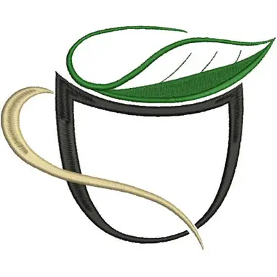 This digital machine embroidery design features a stylized coffee cup adorned with a green leaf and a gentle swirl, symbolizing freshness and warmth. Available in all hoop sizes.
