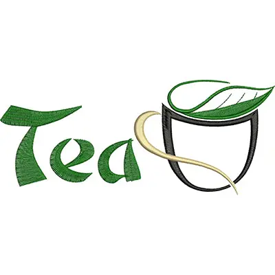 This digital machine embroidery design features the word "Tea" styled with a green leaf and a cup, featuring flowing letters and a graceful curve representing steam. Available in all hoop sizes.