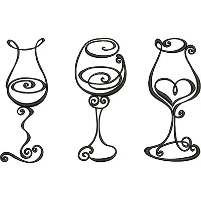 This embroidery design features three elegantly styled wine glasses with swirling lines and decorative elements. Available in all hoop sizes.