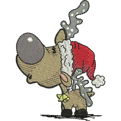 This digital machine embroidery design features a cheerful reindeer wearing a red Santa hat and a yellow bell around its neck, featuring playful antlers and a friendly expression.