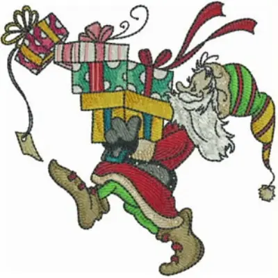 This digital machine embroidery design features a cheerful character in a colorful outfit joyfully carrying a stack of beautifully wrapped presents. Available for 5X5 hoops.