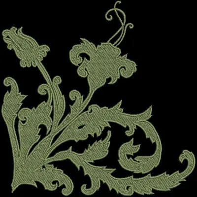 This digital machine embroidery design features an intricate floral motif featuring stylized leaves and blossoms in a soft green shade. Available in all hoop sizes.