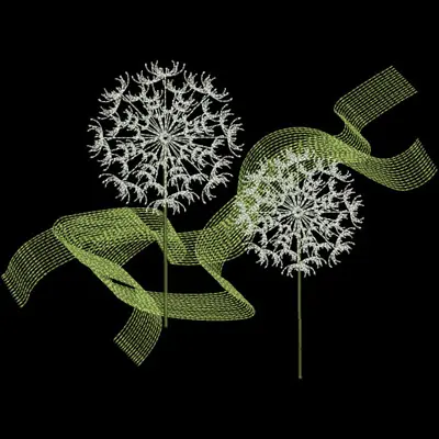 This digital machine embroidery design features two intricately detailed dandelion puff flowers adorned with a flowing green ribbon. Available in all hoop sizes.