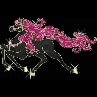This digital machine embroidery design features a galloping horse with vibrant pink mane and sparkling accents. Available in all hoop sizes.