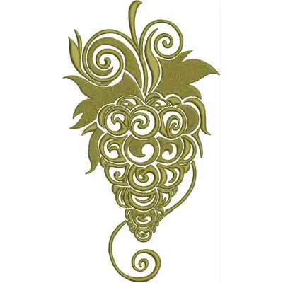 This digital machine embroidery design features a stylized grape cluster featuring intricate swirls and leaves in a soft green color. Available in all hoop sizes.