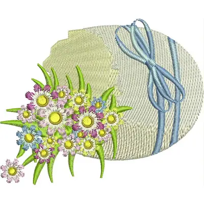 Digital machine embroidery design "ECE Cracked Egg" in the easter theme for 4x5 hoops an embroidery design of a bonnet adorned with a vibrant bouquet of flowers, featuring daisies in shades of yellow and purple, and accented with a blue ribbon. from Kreations by Kara.