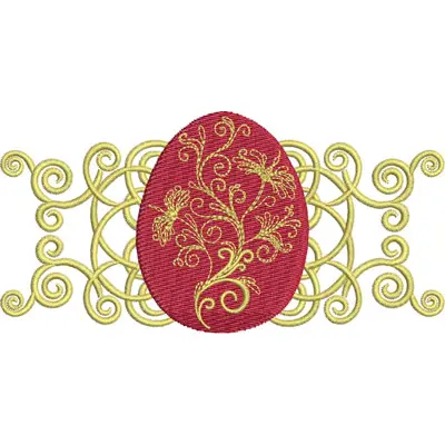 This digital machine embroidery design features a red egg adorned with intricate floral patterns, surrounded by elegant yellow swirls. Available for 4X5 hoops.