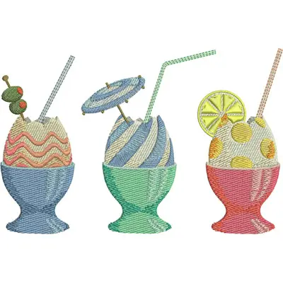 This digital machine embroidery design features three colorful ice cream sundaes, each with unique toppings and garnishes, presented in different bowls. Available for 5X7 hoops.