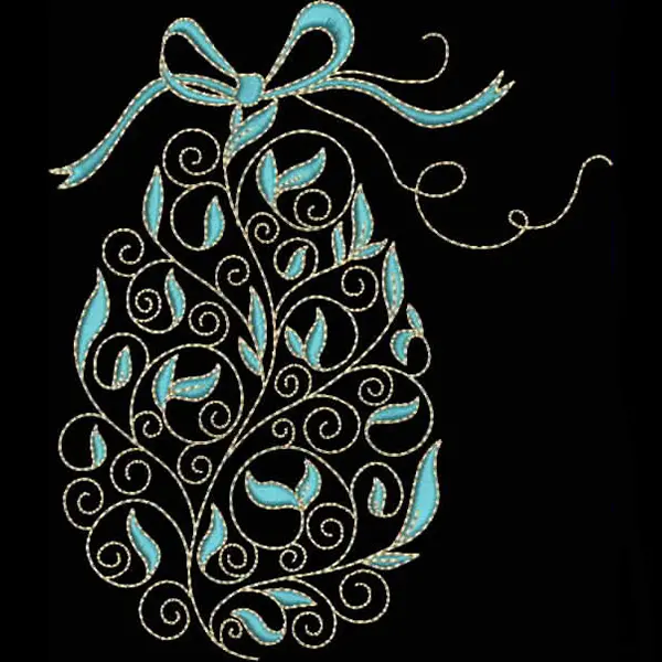 Digital machine embroidery design "EE Leafy Egg" in the easter theme for 5x7, 8x10 and 12x12- hoops an embroidery design of an intricate floral arrangement featuring swirls and teal leaves, topped with a delicate bow. from Kreations by Kara.