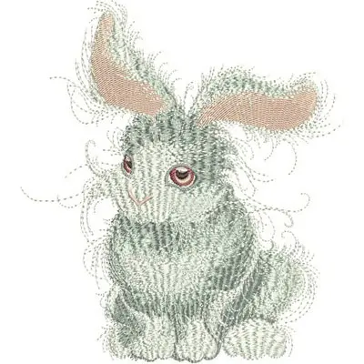 This digital machine embroidery design features a whimsical, fluffy rabbit with large ears and expressive eyes. Available in all hoop sizes.