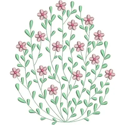 This digital machine embroidery design features delicate pink flowers intertwined with green leaves, arranged in a graceful, oval shape. Available in all hoop sizes.