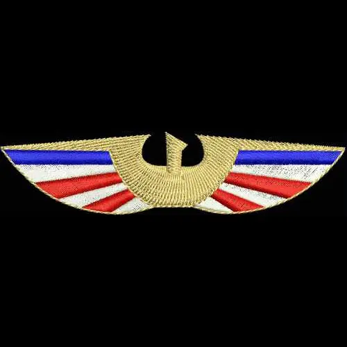 This digital machine embroidery design features a stylized wing emblem featuring gold and red, white, and blue stripes. Available for 4X4 hoops.