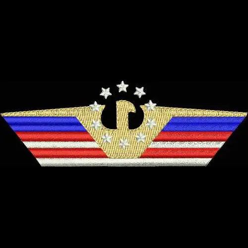 This digital machine embroidery design features a stylized emblem featuring a central bold shape surrounded by stars and stripes in red, white, and blue colors. Available for 4X4 hoops.
