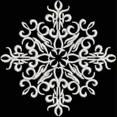 This digital machine embroidery design features an intricate and symmetrical snowflake featuring elegant swirls and pointed elements. Available for 4X4 hoops.
