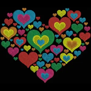An embroidery design of a vibrant heart shape filled with various colorful hearts in different sizes and hues..
