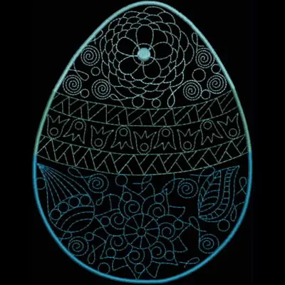 This digital machine embroidery design features an intricately detailed egg shape featuring various patterns, including floral and spiral motifs, as well as geometric shapes. Available in all hoop sizes.