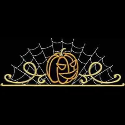 This digital machine embroidery design features a smiling pumpkin framed by a delicate spider web and whimsical swirls. Available for 4X5 hoops.