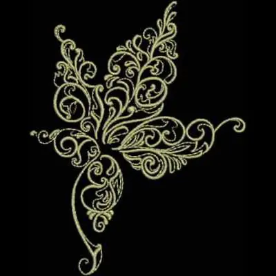 This digital machine embroidery design features a stylized butterfly with intricate swirls and floral elements. Available for 4X5 hoops.