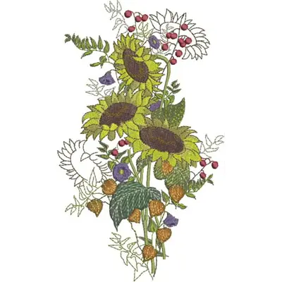 An embroidery design of a vibrant bouquet featuring sunflowers, berries, and various greenery elements..