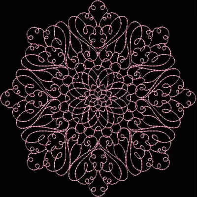 This digital machine embroidery design features an intricate, symmetrical floral pattern featuring delicate swirls and loops in a pink thread. Available in all hoop sizes.