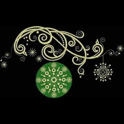 This embroidery design features elegant swirling patterns and snowflakes surrounding a green circular ornament. Available in all hoop sizes.