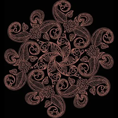 This digital machine embroidery design features intertwined floral motifs featuring swirling leaves and blossoms, creating a symmetrical pattern. Available in all hoop sizes.