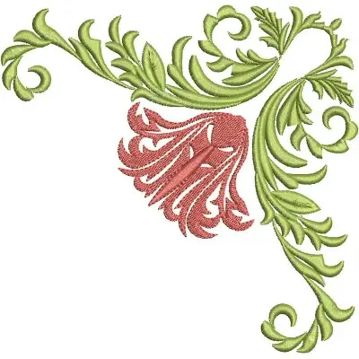 This digital machine embroidery design features ornate green leaves gracefully framing a pink bell-shaped flower. Available in all hoop sizes.