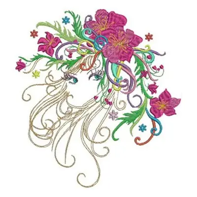 This digital machine embroidery design features a whimsical face adorned with vibrant flowers and flowing hair, capturing a sense of beauty and nature. Available in all hoop sizes.
